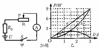 小明应用如图甲所示的电路“探究定值电阻R0的发热功率P0、滑动变阻器R消耗的电功率PR和电源总功率PU随电流I变化的关系”,将得到的数据绘成a、b、c三条图线画在了同一坐标系中,如图乙所示,b图线表示定值电阻R0的发热功率P0随电流I变化的关系,则表示“电源总功率PU随电流I变化的关系