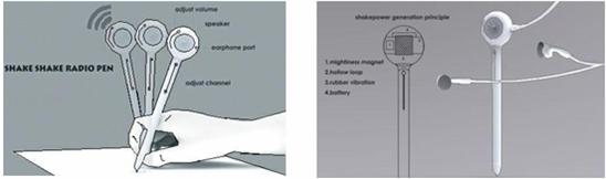 你有没有留神过,我们写字的时候,笔的上端都会小弧度的来回摇摆.有细心的中国设计师就发现了这个细微的动作,根据物理学原理设计出一款“收音机钢笔”,希望给在繁重功课压力下的学生朋友增添一些乐趣.这支钢笔内置有电池,当你书写的时候,【笔端摇摇摆摆产生电流】,就能给电池储存电量.而钢笔上面的频道调节、音量调节、耳机插孔、音响等配置一个不少.如此一来,在枯燥的学习之中你便可以听听音乐或是新闻,以缓和学习的压力.但是家长们应该不会赞同这样的设计吧,不是做功课的时候就应该乖乖做功课么?