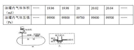 (3)若油罐中油的体积为10.04m3,罐内气体压强与其体积关系如下表所示(吸气阀未打开前气体质量、温度保持不变),则在加油多长时间后,吸气阀会立即打开?(3分)