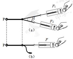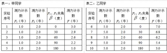 为了研究作用点相同的两个力的合力大小与哪些因素有关,甲、乙两位同学分别用相同实验器材完成了如下实验:①将橡皮筋左端固定于P点。②先用两个弹簧测力计通过细线将橡皮筋右端拉至某一位置并做好标记,再换用一个测力计将橡皮筋的右端拉至同一位置,如图14(a)、(b)所示。③改变两测力计拉力方向的夹角β重复上述实验过程。他们测得的数据分别记录在表一、二中。