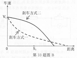 图B反映的是以方式一和方式二刹车所产生的刹车距离的比较。从图中可知,在车速相同时,采用哪种刹车方式刹车后,刹车距离较短? ▲ 。