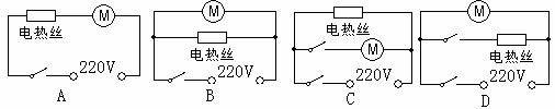 家用电吹风由电动机和电热丝等组成,为了保证电吹风的安全使用,要求:电动机不工作时,电热丝不能发热;电热丝不发热时,电动机仍能工作。下列电路中符合要求的是( )
