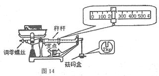(3)图14中的台秤使用前需放在水平桌面上,游码置于零刻度线,调节 使秤杆水平平衡。某次称量情况如图14所示,被称货物的质量是 kg。