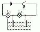 如图所示电路中,把两根碳棒放人纯水中,闭合开关S,逐渐向水中加些细食盐后,灯泡L2的亮度变化是 ,灯泡L1的亮度变化是 , (L1、L2为相同灯泡)