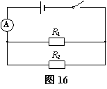 在图16所示的电路中,电源电压保持不变,电阻R2的阻值为15Ω。闭合开关S后,电流表的示数为1A,通过电阻R2的电流为0.4A。求: