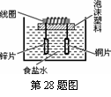 小金设计了一个如图所示的线圈指南针,将它放入盛有食盐水的水槽中(铜片和锌片分别与线圈两端相连后放入食盐水构成了化学电池,铜片为正极,锌片为负极),浮在液面上的线圈因为 的存在能指示方向;若交换铜片和锌片位置,线圈的磁极将 (选填“会”或“不会”)改变。