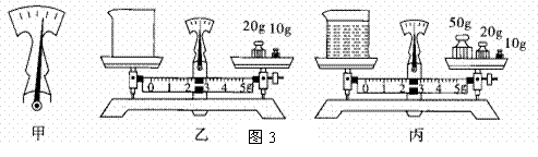 小王把天平放在水平台上,将游码拨到零刻度处后,指针静止时出现如图3甲的情形,此时应向 调平衡螺母,使天平横梁平衡。由图3乙、丙可知烧杯的质量为 g ,烧杯中液体的质量是 g。