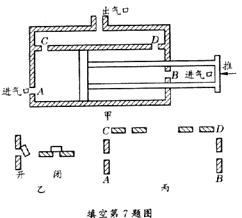 图甲所示,为农户用的一种风箱的结构示意图,其中在A、B、C、D四处分别装有单向通风阀门,使得无论向左推或向右推活塞时,风箱都能向灶中送风。若此时正向左推活塞,请在丙图中画出这时阀门的开、闭状态。作图时可参照图乙的画法。