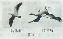 中新网2009年5月20日电:英国《每日邮报》19日刊登了一组照片,如图10所示。灰鹅在飞行途中突遇强风,这只艺高胆大的灰鹅做出了令人吃惊的动作——以飞行方向为轴线,横向转体180度,但最难的是——它的头部依然保持着正常飞行时的姿态!虽然这看起来有些不可思议,连世界上最优秀的运动员都会被其柔韧的鹅脖所折服。请你思考并回答,灰鹅这样转体的效果是什么,为什么?