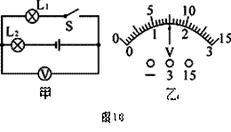如图10甲所示电路,电源电压为6V,当S闭合时,电压表的读数如图乙所示,则L1两端的电压为 V,L2两端的电压为 V.
