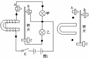 小华利用自己绕制的电磁铁设计了一个能使甲、乙两灯交替发光的电路,电磁铁及电路图如图3所示。你认为在开关闭合后实际会看到什么现象?请把更正后的电磁铁及电路画在图右的空白处。(A、B为带活动触点的接线柱,BC间为铁片。)