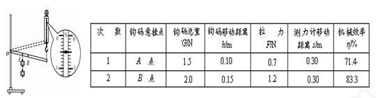 研究杠杆的机械效率与哪些因素有关,一位同学用该实验装置,先后将钩码挂在A、B两点,测量并计算得到下表所示的两组数据: