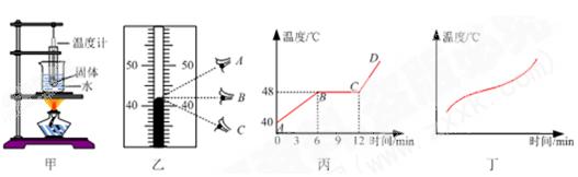 (2)将温度计正确插入蜂蜡和海波中,观察温度计示数时视线A、B、C如图乙所示,其中正确的是________________,此时温度计的示数是____________℃;
