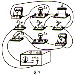 如图21所示,已知小灯泡L1的额定电压为2V,L2的额定电压为6V,电源电压保持不变。当开关S1和S4闭合,S2和S3断开时,电压表示数为5V,L1实际消耗的