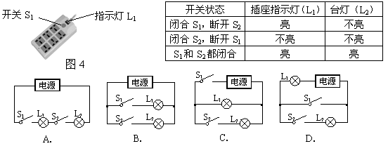 小明家台灯的插头插在如图4所示的插座上,插座上有一个开关和一个指示灯(相当于电阻很大的灯泡)。若插座开关和指示灯用S1、L1表示,台灯开关和灯泡用S2、L2表示。小明断开或闭合S1、S2时,记录现象如下表。则符合事实的电路图是( )