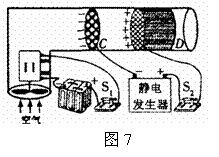 近段时间全国很多北方城市深受雾霾的影响,PM2.5是指大气中直径不大于2.51μm的颗粒悬浮物,能被肺泡吸收并进入血液,影响人体健康。某科研队伍成功研制出PM2.5净化器,其原理如图7所示。闭合开关S1、S2后,风扇旋转吸入含有颗粒物空气,当颗粒物接近带有负电荷的光洁金属网C时会被快速吸引过来,这是因为带电体具有吸引_________的性质;当颗粒物快速通过光洁金属网C后,会带上负电荷,然后被带有正电荷的棉芯D吸附住,这是因为异种电荷互相______。