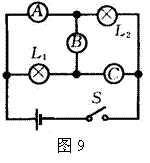 在如图9所示的电路中,电源电压和灯泡的电阻不变,A、B、C分别表示电流表或电压表,当S闭合,L1和L2两灯都发光。当L1和L2以某种方式连接时,B表的示数大小为12,A表的示数为3A;当L1和L2以另一种方式连接时,此时B表应为 表(选填“电压”或“电流”),若B表的示数大小为1,则灯泡L1的电阻为 Ω,L2的电阻为 Ω。