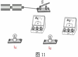 (2)如图11,按要求连接实物图:两灯泡并联,开关S是总开关,电路中的总电流约为0.5A,其中电流表A1只测通过L1的电流,A2只测通过L2的电流。