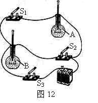 在“比较两种液体比热容的大小”实验中,提供的装有液体、发热电阻丝和温度计的烧瓶(各烧瓶完全相同;各烧瓶中的液体种类不同、质量相同;各烧瓶中发热电阻丝完全相同)若干,其他器材任选。(1)小明选用的两个烧瓶中分别装有A、B两种液体,选用的其他器材及实物连接图如图12所示。给A、B两种液体加热时,为了保证加热时间即吸收的热量相等,小明应该先闭合开关 ,再闭合开关 ;通过观察,发现A液体中温度计示数的变化量大,则_________液体比热容大;(2)小明将装有A液体的烧瓶换成装有C液体的烧瓶,将装有B液体的烧瓶换成装有D液体的烧瓶。其他器材及实物连接关系不变,又做了一次实验,发现C液体温度升高得快,一段时间后,断开S1,同时记下C液体中温度计示数的变化量△t。又过了一段时间,当D液体中温度计示数的变化量也等于△t时,断开S2,因为_________液体加热时间短,所以_________液体比热容小。