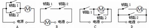 县档案馆保密室的电动门有下列要求:控制电路的两把钥匙分别由两名工作人员保管,单把钥匙无法打开,只有两把钥匙共同使用才能打开。下图电路中符合要求的是