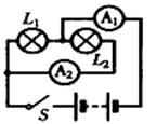 如图所示的电路,当开关S闭合时,电流表A2测 ▲ (填:L1或L2或L1+L2)的电流,若电流表A1的示数为0.8A,电流表A2的示数为0.5A,则流过L1的电流为 ▲ 。