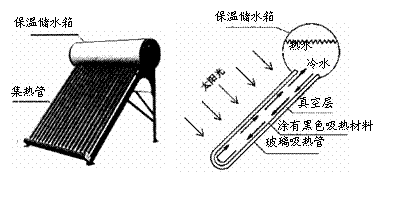 当太阳光入射到黑色的吸热层上时,黑色吸热层能把太阳能更有效地转化为内能,将管内的水加热。向光一侧的水被加热后体积增大、密度变小而向上运动;背光一侧的水由于温度较低、密度较大而向下运动,形成冷热水循环,最终整箱水都升高至一定的温度。玻璃吸热管具有吸热保温作用。
