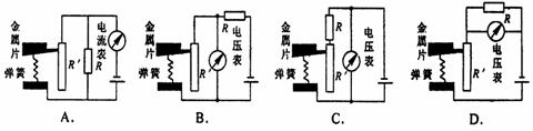 小明同学在物理实践活动中,设计了图8中的四种用电流表或电压表的示数反映弹簧所受压力大小的电路,其中R′是滑动变阻器,R是定值电阻,电源两极间电压恒定,四种电路中有一个电路实现压力增大,使电表的示数增大,这个电路是