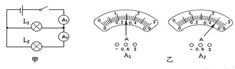 .如图甲所示,电灯L1、L2两灯并联,其中电流表A2是测量 的电流。两只电流表的示数分别由乙中两图读得,则电灯L1中的电流是 。
