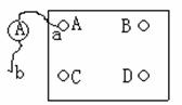 如图所示暗箱中装有灯泡、电阻、电池,面板上装有A、B、C、D四个接线柱和灯泡的玻璃泡(两接线柱间只能接一个元件)。为了弄清箱内电路连接情况,用电流表两个接头a、b测试,若a和A一直相接, b依次和B、C、D相接,发现①b接B时灯不亮,电流表示数为零;②b接C时,灯亮,电流表有示数;③b接D时灯光减弱,电流表示数减小。试根据上述情况画出箱内电路图。