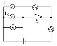 如图所示,当开关由闭合到断开时,电压表和电流表的示数变化的情况是:A1 ;A2 ;V 。