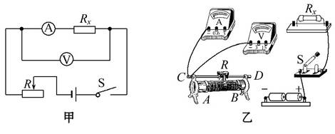 如图甲所示是伏安法测电阻的另一种电路图。如图乙所示是作了部分连接的电路实物图。请依据图甲用笔画线代替导线,将图乙所示的实物图补充连接成完整电路。