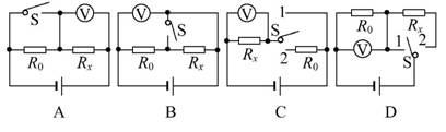 某同学在没有电流表的情况下,利用电压表和已知阻值的定值电阻R0,测量未知电阻Rx的阻值,图中不能测量Rx阻值的电路图是( )