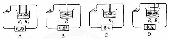 如图所示,在四个相同水槽中盛有质量和温度都相同的纯水,现将阻值为R1、R2的电阻丝(R1<R2),分别按下图的四种方式连接放人水槽,并接人相同电源。通电相同时间后,水温最高的是