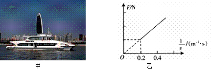 (4)某次运行中游船以300kW的恒定功率启动并保持该恒定功率沿直线运行,行驶过程中所受阻力不变,速度由零逐渐增大至最大值而保持匀速直线运动.运动过程中牵引力F与速度的倒数(1/v)的关系图线如图乙中的实线所示,则游船运动的最大速度为