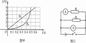 如图甲所示是某兴趣小组在做‘伏安法测电阻”实验中分别作出R1、R2的U—I图象。小枫利用R1、R2两个电阻设计了如图乙所示的实验电路,闭合开关,电流表示数为0.6A,则下列说法