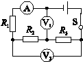 在如上右图所示的电路中,电源电压不变,闭合开关S,电压表V1与V2示数之比为3︰4,电流表A的示数为1A,电阻R1的功率是4W。若将电压表V2换成电流表A2,电流表A2的示数为3A