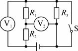 如图所示电路,电源电压不变,电阻R1=10Ω,当开关S闭合时,电压表Vl和V2的示数之比是3:1,当开关S断开时,R2和R3的功率之和是R1功率的4倍。关于此电路以下说法中正确的是( )
