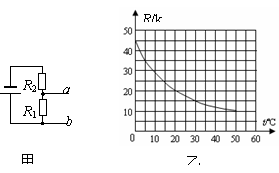 某自动恒温箱的控制电路如图甲(a、b端所控制的加热电路未画出).箱内电阻Rl=5kΩ,R2为热敏电阻,其阻值随温度变化的图像如图乙所示,电源电压为12 V.当a、b间的电压Uab小于2.4 V时,恒温箱内的电热丝通电加热;当a、b间的电压Uab大于3 V时,电热丝停止加热.