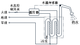 量到的水温和预先设定的温度进行比较,然后即时控制温控器内的两个开关的状态,从而让喷头喷出预先设定温度的热水。请在图乙虚线框中补齐温控器内的两个开关。(2分)