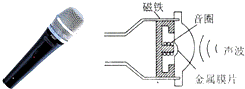 如图所示是一种常用的动圈式话筒(麦克风)及其原理图.当你对着话筒说话时,声带__________发出声音,声波使与金属膜片相连的音圈振动.音圈即线圈,它在磁场中能产生随声音变化而变化的电流,这是__________现象.这个过程将声音信号转变成__________信号.