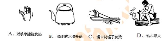 1)冬天,人们用两只手掌相互摩擦取暖         2)在古代,人类钻木取火