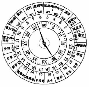 图1-2是根据广西北海市一家宾馆中所挂钟表的照片绘制的示意图,图中秒针、分针和标有24个数字的转盘都沿顺时针方向转动。根据钟表的示数,这张照片是在北京时间(按24小时制计时)______时______分______秒拍摄的。