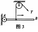 如图3所示装置中,均匀木棒AB的A端固定在铰链上,悬线一端绕过一固定定滑轮,另一端用线套套在木棒上使棒保持水平。现使线套逐渐向右移动,但始终使木棒保持水平,则悬 线上的拉力T(棒和悬线足够长)